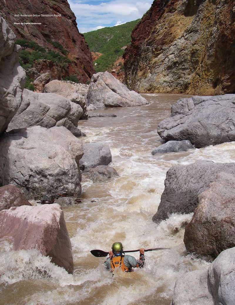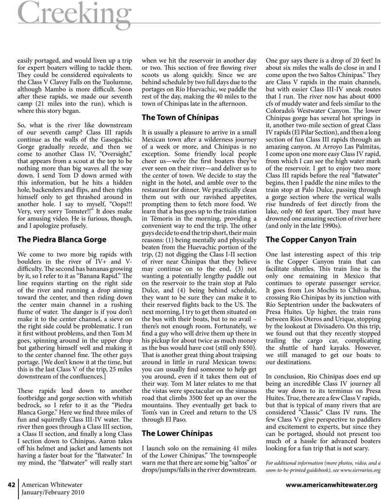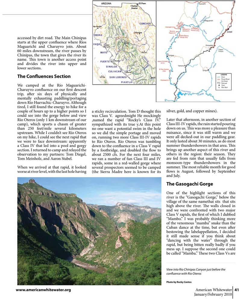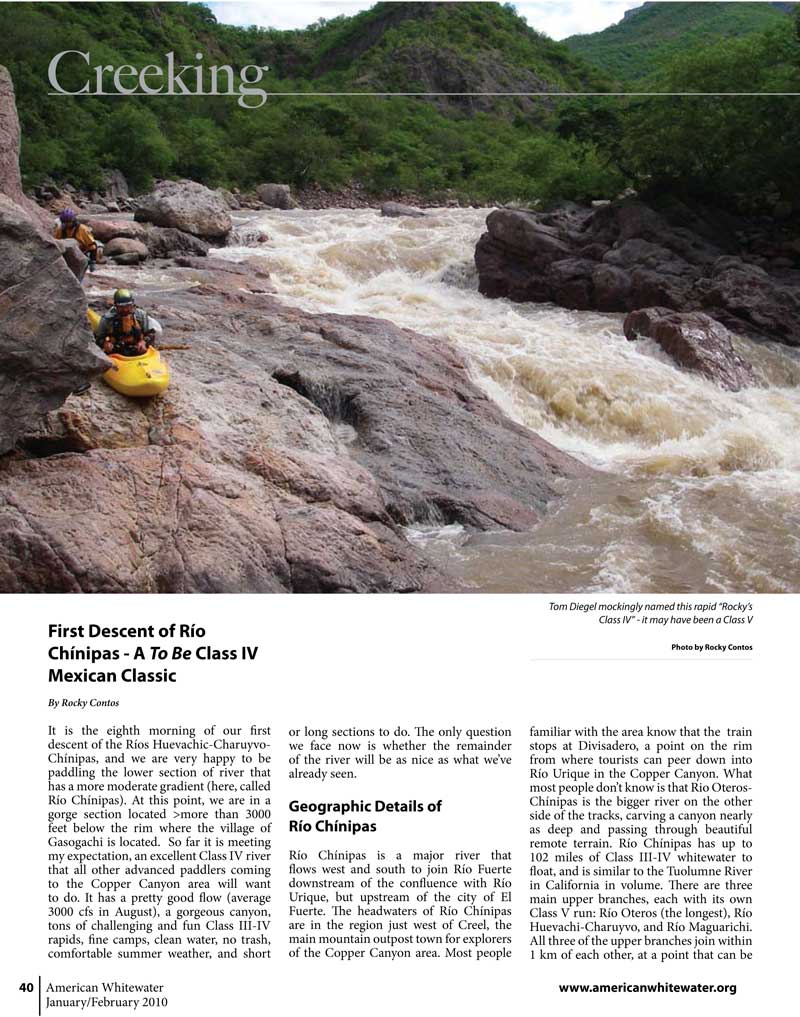 Kayaking a first descent on Río Chínipas: Chihuahua, Mexico. AWA Jan/Feb 2010 pp. 40-43. by Rocky Contos.
