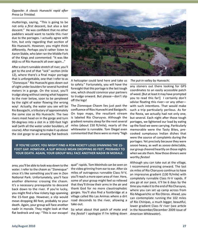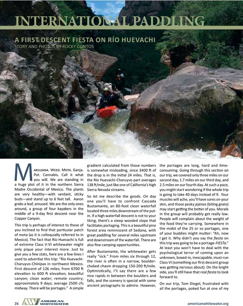 A first descent of Río Huevachi: Chihuahua, Mexico. American Whitewater Jul-Aug 2010; pp. 26-29; by Rocky Contos.