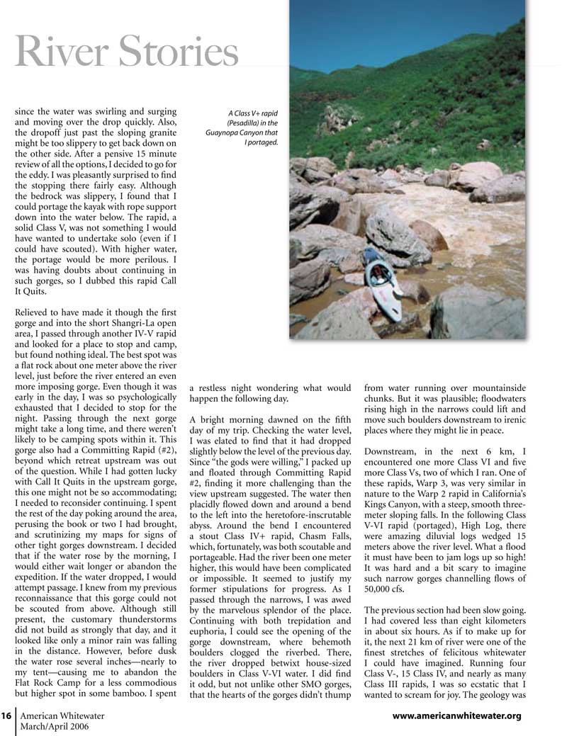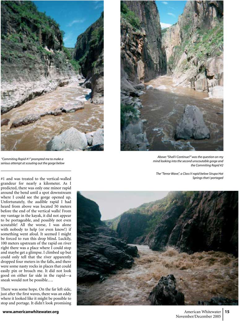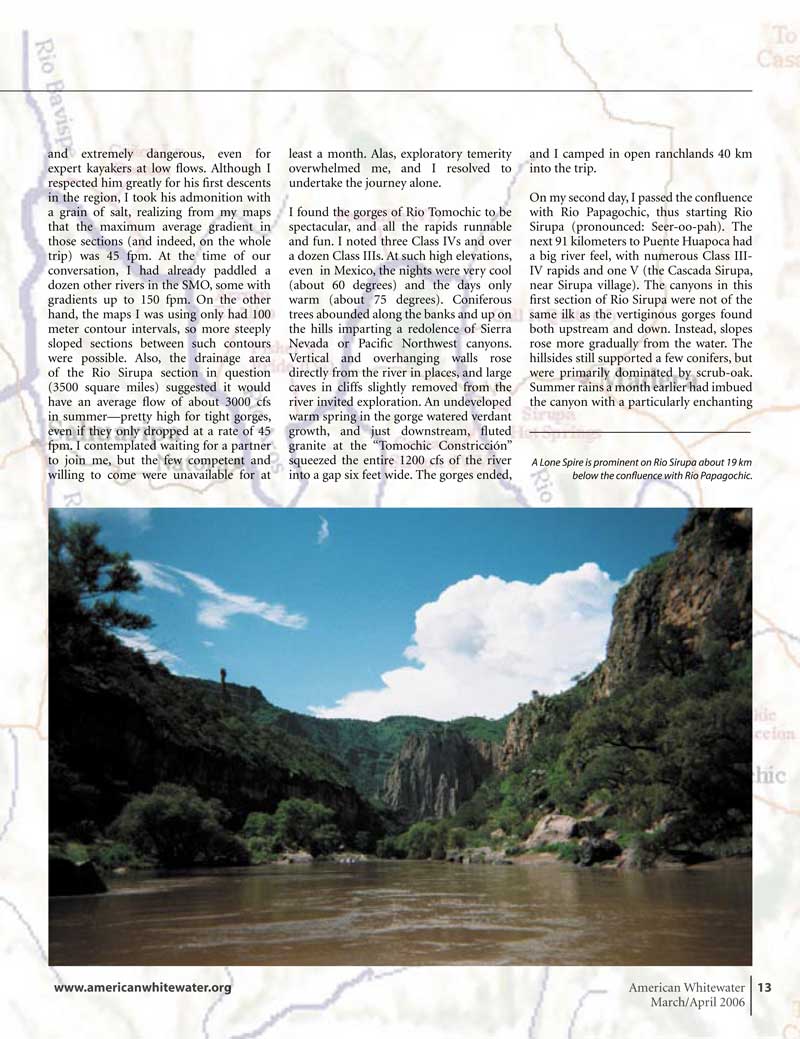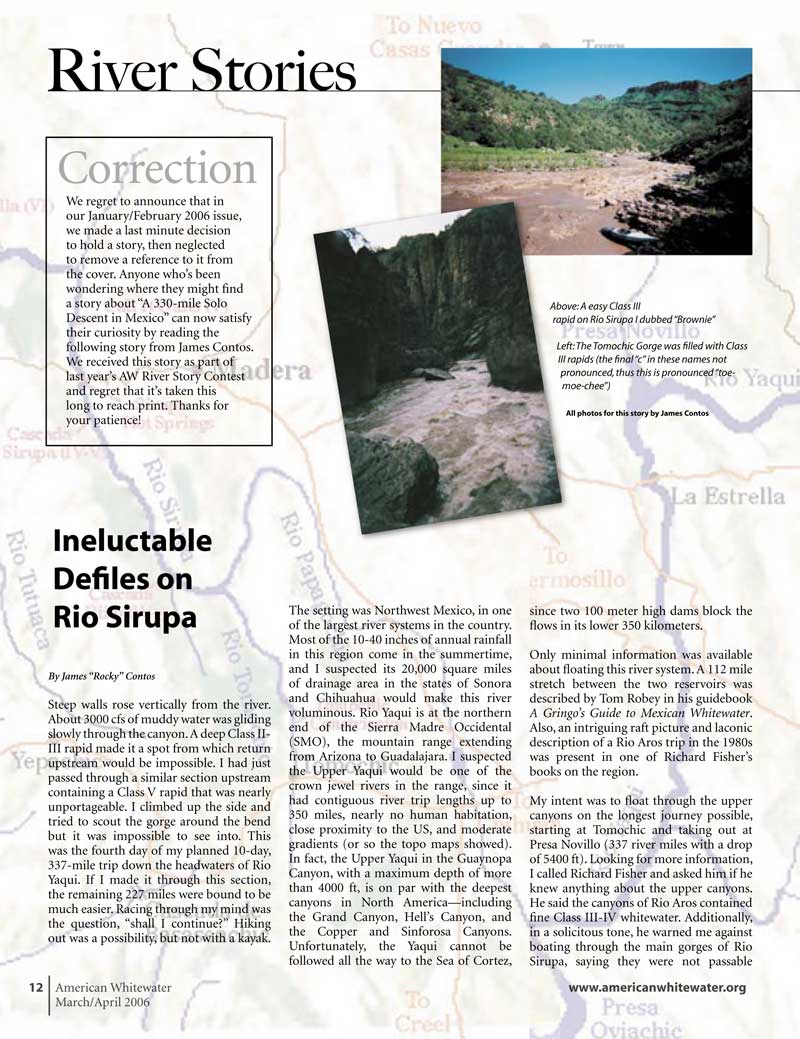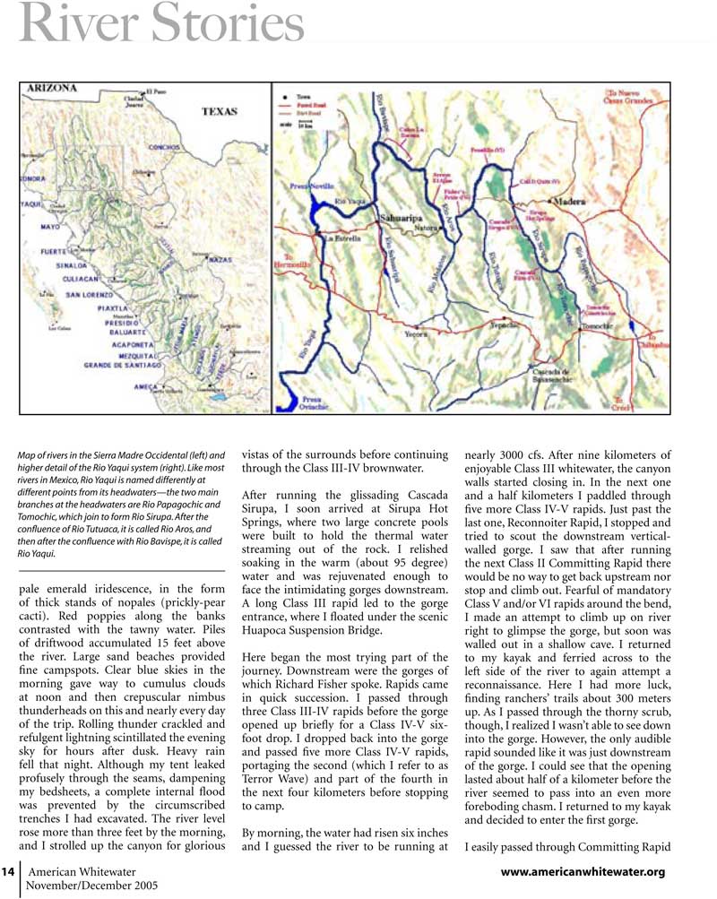 | Kayaking Ríos Tomochi-Sirupa-Aros: Chihuahua-Sonora, Mexico. American Whitewater Mar-Apr 2006; pp. 12-17; by Rocky Contos. | ||||||||||||||||||||||||||||