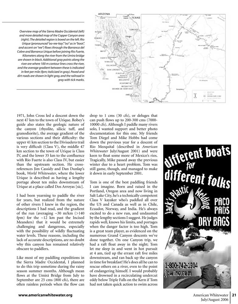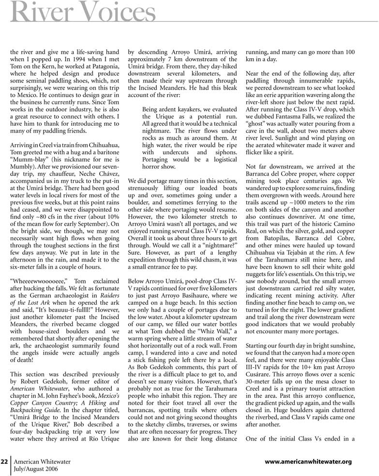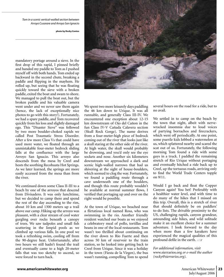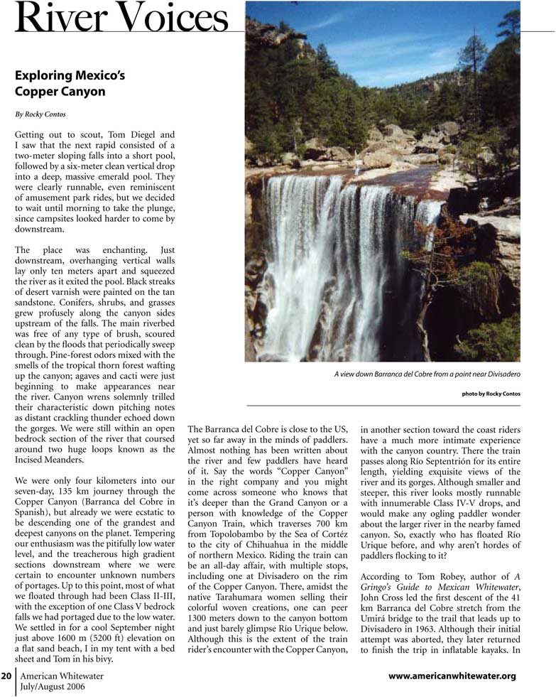| Kayaking Río Urique through Barranca del Cobre: Chihuahua, Mexico. AWA Jul/Aug 2006 pp. 20-23. by Rocky Contos. | |||||||||||||||||||||||||||