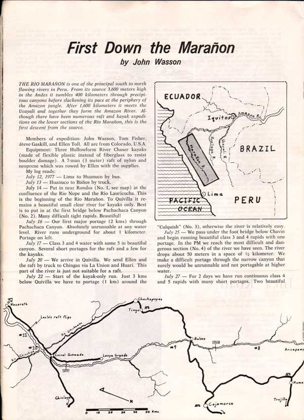First Down the Marañon. South American Explorer #2, 1978; by John Wasson. [permission to reprint given by John Wasson]