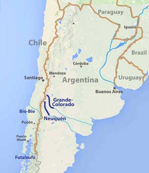 MENDOZA/SAN RAFAEL: Our main rendezvous will be San Rafael, located in Mendoza province. San Rafael is a 3 hr drive to the southeast of the city of Mendoza and also in the main wine country. San Rafael has ~200,000 people, while Mendoza has roughly 1.1 million people in its metro area. The city of Mendoza is the capital of the eponymous province, known for its robust red wine often made from Malbec varietal grapes. Tourists to Mendoza or San Rafael often spend at least one day visiting wineries or other sites in the area (the Río Atuel is a popular day excursion close to San Rafael). Mendoza has an airport with service to Buenos Aires and Santiago, while San Rafael has service to Buenos Aires only. Other paddling opportunities in the area exist on Río Mendoza (IV), Tunuyan (III and IV), Diamante (V), Atuel (II or IV), and the Vavarco-Neuquén (II to V).