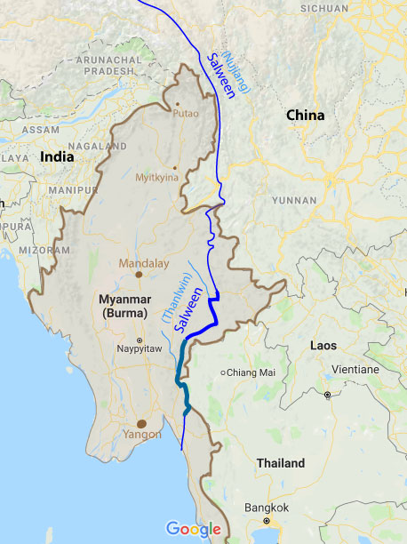 The Final Gorge section of the Salween passes through the final canyon and gorge on the river before it empties into the Indian Ocean. It straddles the border with Thailand for about 30 km and a national park there. The main rapids are located in the final ~80 km of the river and have never been paddled by modern whitwater boaters. These rapids present a major obstacle to anyone attempting to navigate the river upstream from the ocean, and have isolated most of the river and its beautiful canyon for centuries. This is possibly the nicest section of the river to paddle in Myanmar, and perhaps one of the finest in the world. With a massive average flow of ~4500 cms (150,000 cfs) it is sure to have some amazing whirlpools, currents, waves, eddies and beaches. Clear sidestreams with waterfalls should be a delight to visit and wash/bathe in. There are Karen and Karenni people living along the way, as well as Thai and many others. A giant dam is planned for the gorge that would flood these amazing and fun rapids and negatively affect the residents in the area. Sign the PETITION. Join us and be the first to navigate one of the most impressive rivers in the world!! As of March 2018, this section has NEVER BEEN PADDLED. We intend to raft and kayak the first descent in Apr-May2018 should we get the permit.