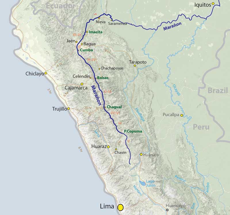 This shows a general overview of Río Marañon and the various access points. Times are bus routes between general cities. Regular flights are available from Lima to Cajamarca, Chiclayo or Tarapoto. In 2012 there were flights from Trujillo to Chagual on Thursday and Saturday morning. Topo maps of the river are also available.