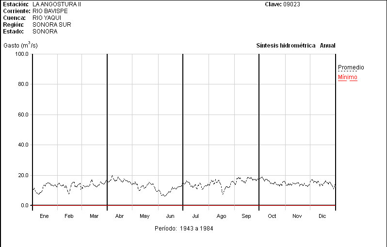 Mean flow for Rio Bavispe at the La Angostura II Gauging Station (below the dam). Click "Next" to see individual years.