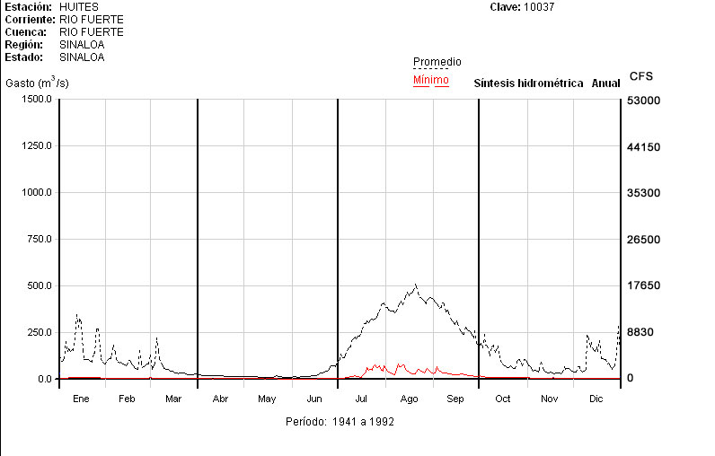 Mean flow for Rio Fuerte at the Huites Gauging Station (before the dam). Click "Next" to see individual years.