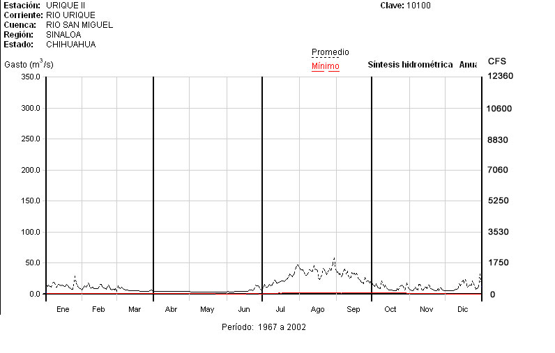 Average flow for Rio Urique at the UriqueII Gauging Station (upstream of the town of Urique). Click "Next" to see individual years.