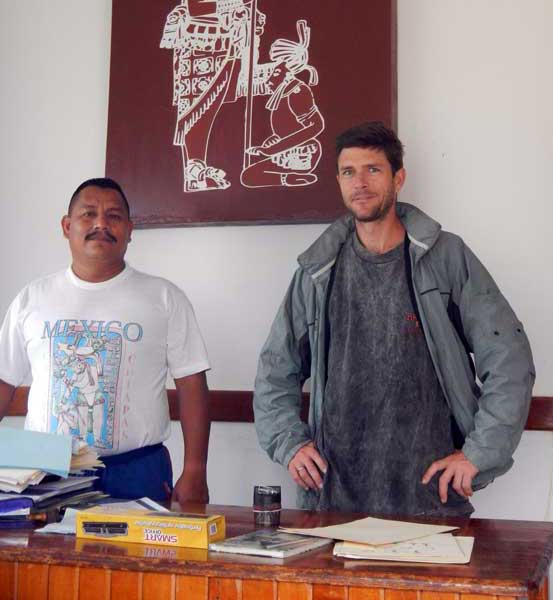 USUMACINTA: The beginnings of a guide training program were initiated for bilingual Spanish/Chol-speaking residents of Frontera (and possibly Arroyo Jerusalen). So far two hombres took the big leap of faith to journey down the river with Rocky. [there is a lot of fear among the residents of the rapids/whirlpools in the Gran Cañon de San José]. The presidente de Frontera (pictured with Rocky below) is glad to see such a program started in his community. Shown to right: Gregorio Mendez Alvaro (presidente de Frontera Corozal) and Rocky Contos (Director of SierraRios) after conversing about expanding raft/kayak operations in Frontera. |