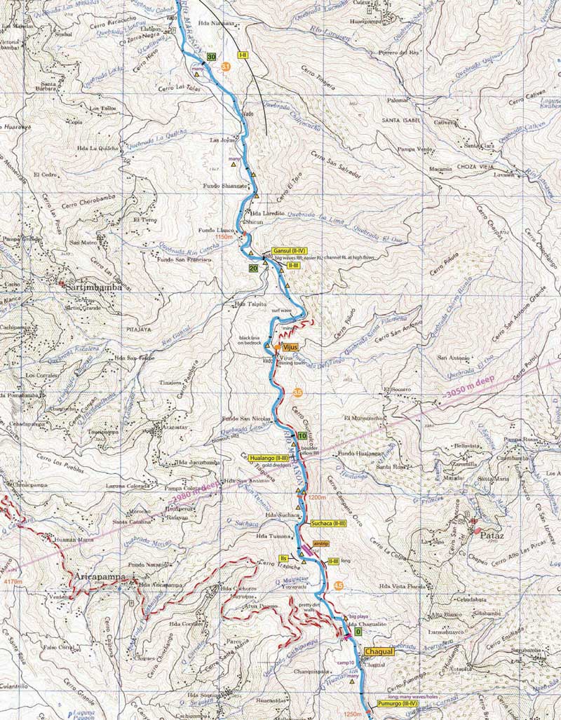 TOPOGRAPHIC MAPS Marked topographic map guides are available to anyone signing up for SierraRios membership with a donation. These are convenient to download, print and use on a trip. For a full membership contribution, the entire Marañon, Huallaga, and other rivers in Northern Peru are provided. You'll also be due a book and video on the area. An example topo map from the Marañon is shown below: