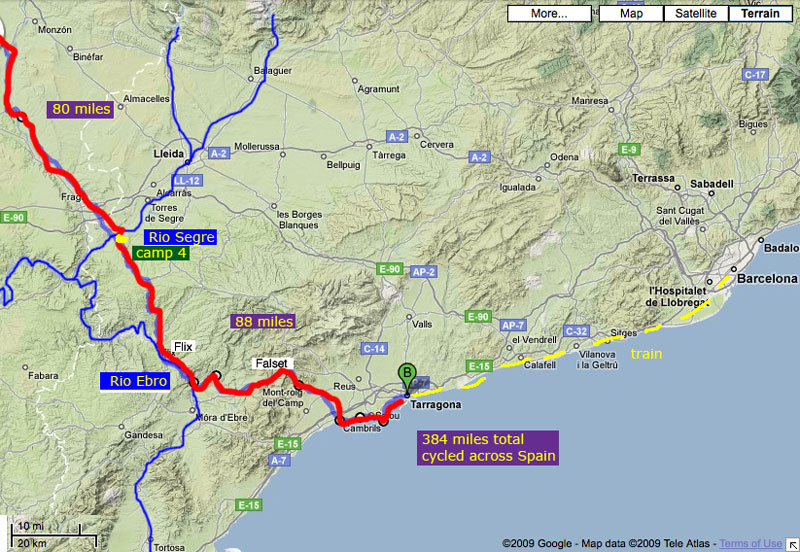 At the end of my 4th day of riding I reached Catalonia (80 mile day) and camped by Rio Segre. I then rode to Tarragona in an 88 mile finale.