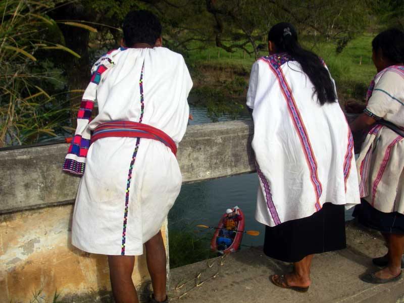 On our first descent of the class V Upper Almandro we started near San Juan Cancuc by this bridge with crowd of indigenous onlookers.