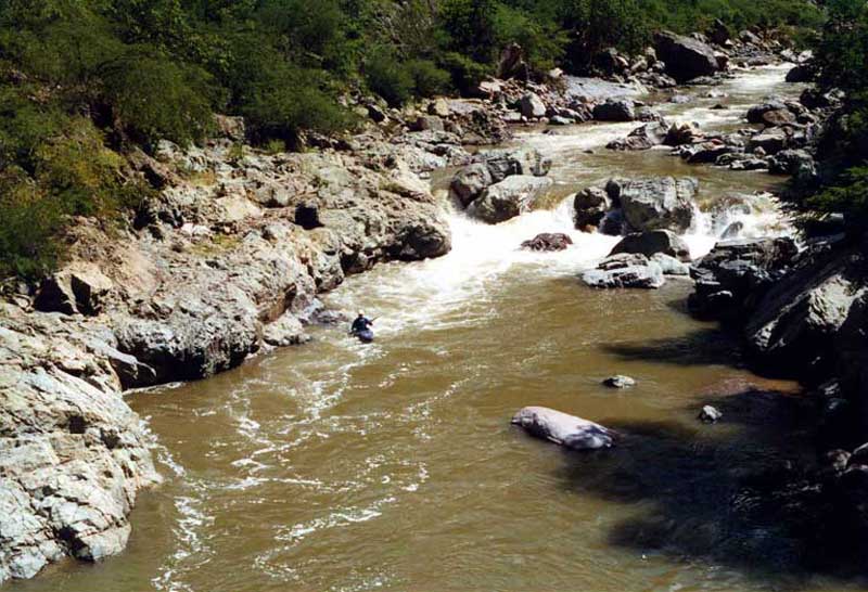 Rio Batopilas has a 10 km 160 fpm class V section starting at the La Bufa Bridge (where this picture was taken). I did it solo in 2001.