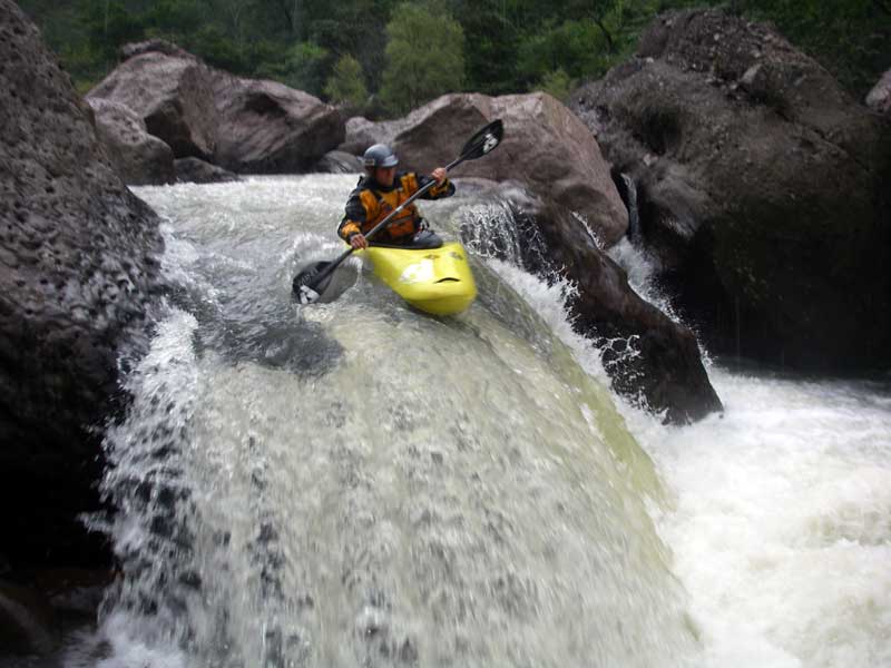 The Puerta de Piaxtla option for class V paddlers involves tackling a approximately 20 km more river that drops 500 m (~25 m/km or 140 fpm). .