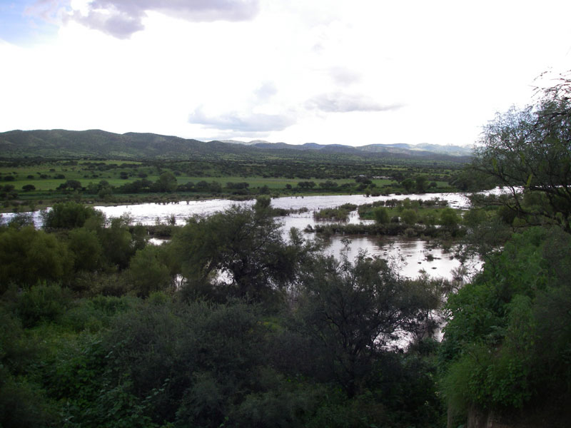 Rio Ramos begins at the confluence of Rios Santiago and Tepehuanes (entering amidst brush the on right in photo). It is 60 km from here to Emiliano Martinez (take-out).